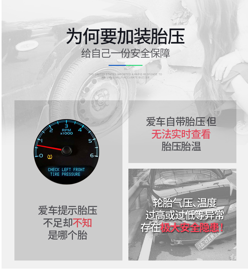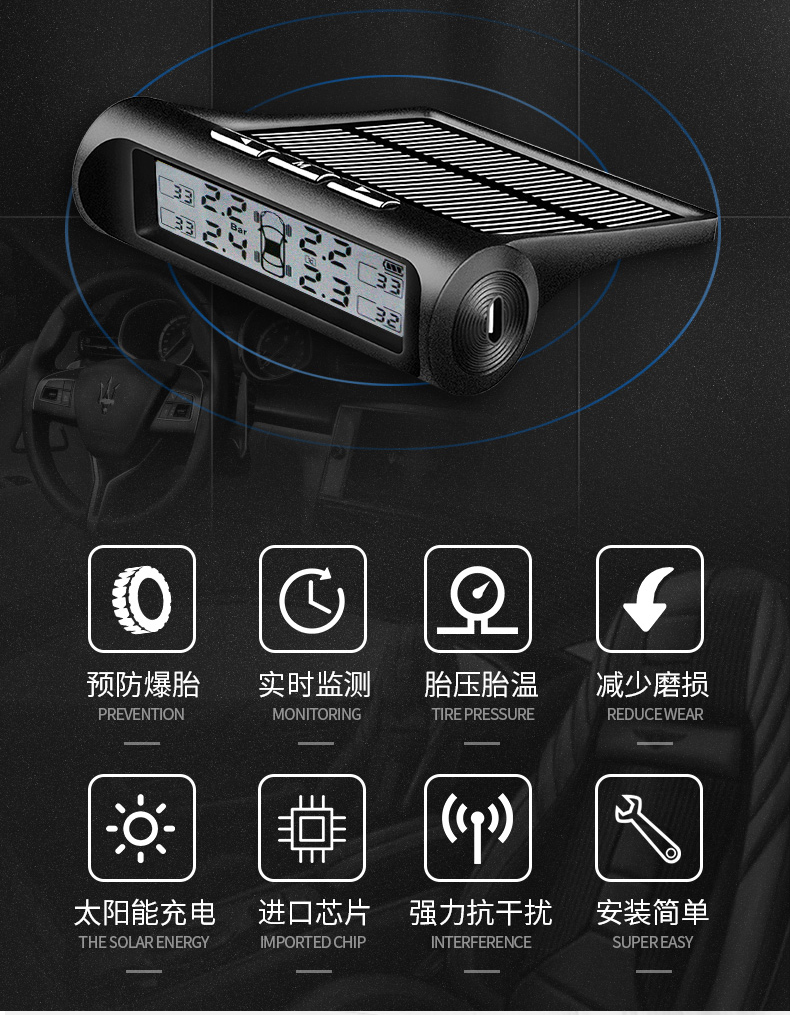 胎压监测器无线太阳能高精度汽车轮胎报警器检测仪通用 黑白屏外置胎压
